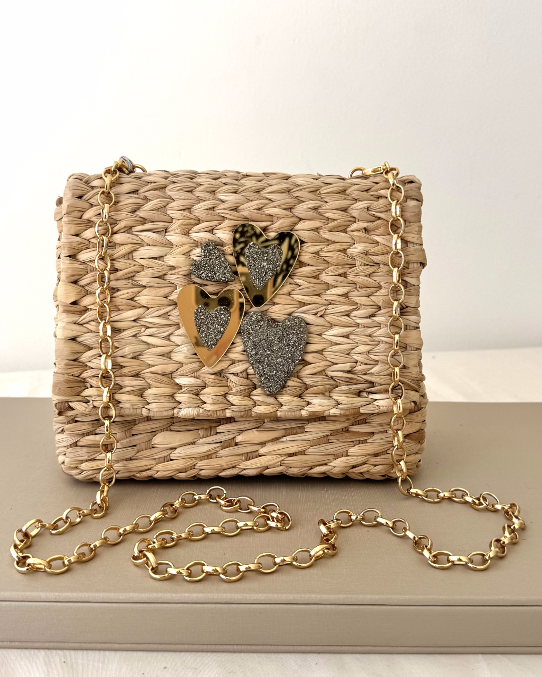 Bolsa feita à mão em palha natural com aplicaçoes em formato de coração cravejados com pirita natural. Alça removível dourada com banho de ouro 18k.